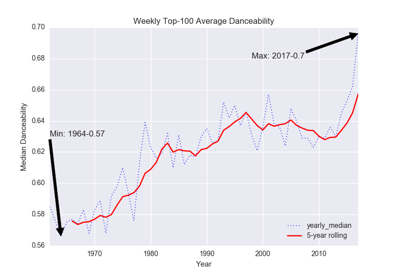 This post, though, is a brief summary of a side project I undertook smack in the middle of the job market process back in February. This exercise was basically a way for me to learn some new Python data management and graphing stuff, and was initially meant as a fun thing to do (i.e., procrastinate) to practice some programming. Essentially, I wanted to build a database of all songs to appear on the weekly Billboard Hot-100 charts, which I could then use to search for correlations or trends between genre tags, intertextual connections, or acoustic phenomena. I didn’t do much besides make some figures that track trends, but I’m hoping this can serve as the basis for a larger project.Since then, I’ve noticed a few blog posts, academic articles, and “news” stories that make use of datasets constructed using Spotify’s (née Echo Nest’s) acoustic parameters along with some Billboard Chart data. These studies all basically look at how popular songs compare to each other synchronically and/or diachronically, posing questions like, “has pop music gotten faster since the 1960s?” or “has popular music become more homogeneous?” Since I did a similar thing, I figured I’d write a post about my project and will give a few concluding thoughts about what it means to use mysterious “acoustic features” to make objective claims about music.