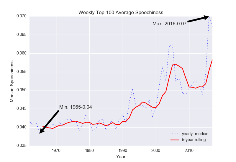[0:4] are from billboard.py, and [5:18] are from the Spotify API. So basically, then, after that I just graphed the (rolling) median/means for each parameter to look for some trends. I took annual median values, which I realize leaves out fuzzier and richer weekly information, but I felt yearly averages were good enough for looking at broad diachronic spans. I might go back and see if there are any seasonal/monthly ebbs/flows to any of these parameters.